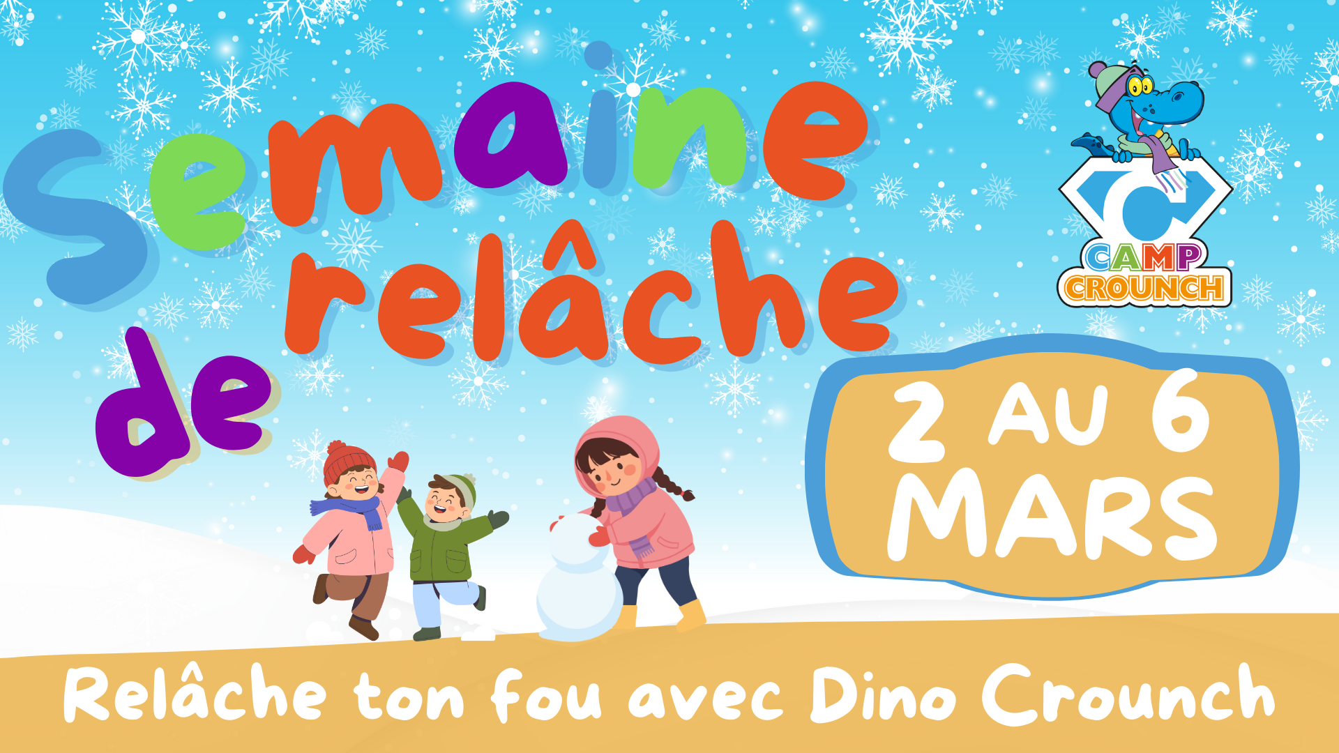 Le camp de jour régulier de la semaine de relâche offre un foule d’activités variées qui stimulent la créativité, la curiosité et la collaboration. Chaque journée est une nouvelle occasion de bouger, jouer, bricoler, explorer les activités hivernales et s’amuser avec une équipe d’animateurs dynamiques et attentionnés. Que ce soit lors d’ateliers sportifs ou artistiques, d’activités intérieures ou extérieures, les campeurs vivent une expérience inoubliable, où le plaisir, la sécurité et la bienveillance sont toujours au rendez-vous.